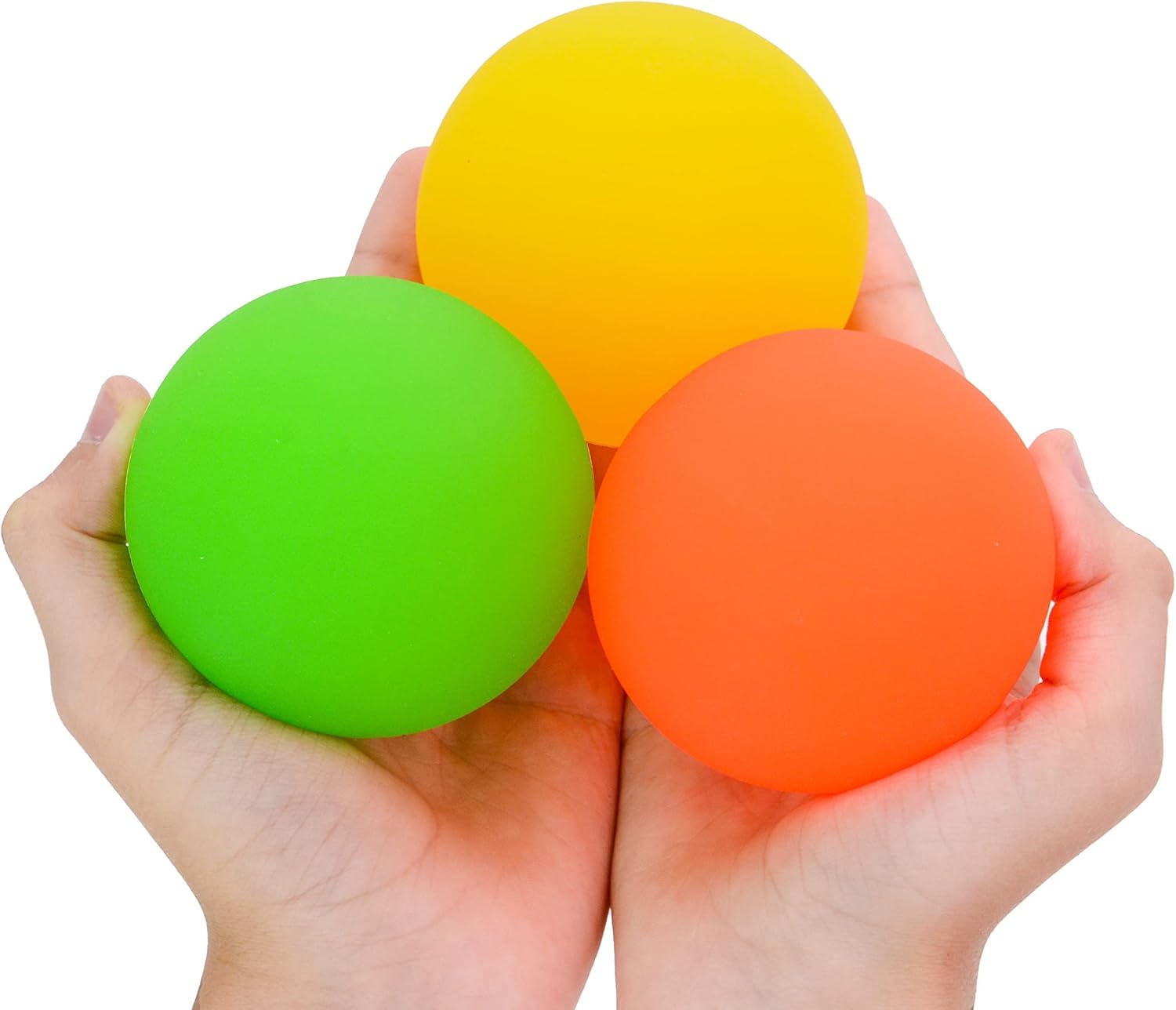 Bouncy balls for kids are 75 mm / 3-inch in diameter. These bouncy balls come in bright pink, orange, yellow, green, blue, and purple. A variety of bright colors will please any child