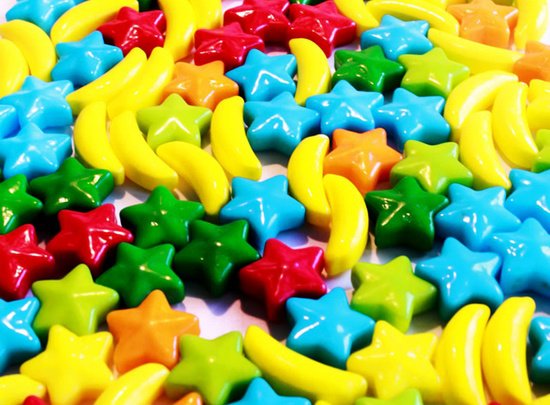 Candy pressed dextrose in various fruit shapes with matching bright colors and sweet taste. They are good for sale in vending machines with portion dispenser.